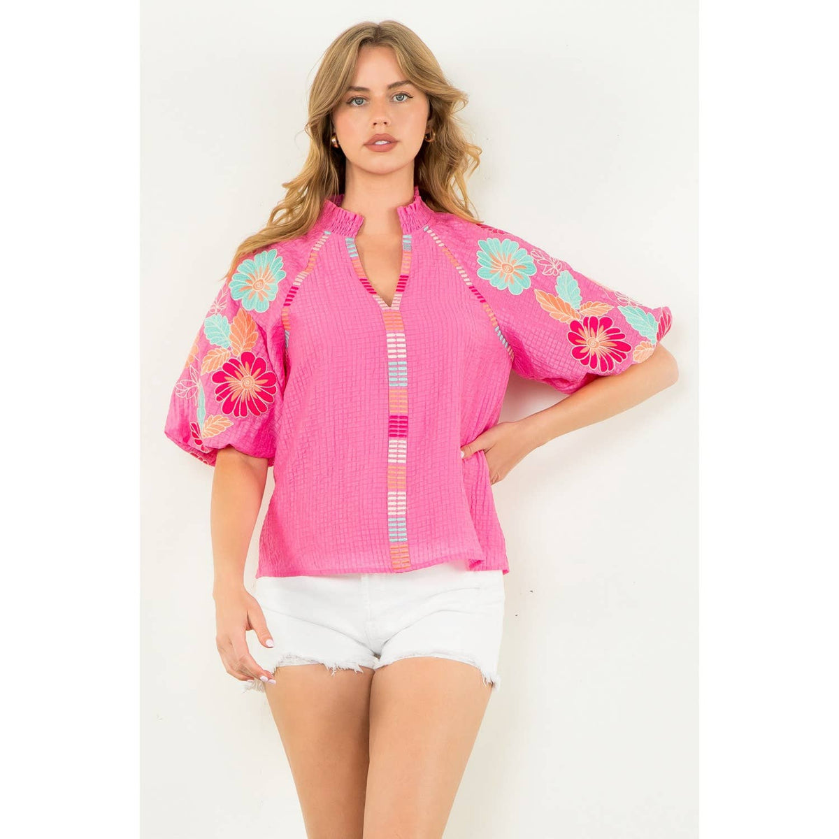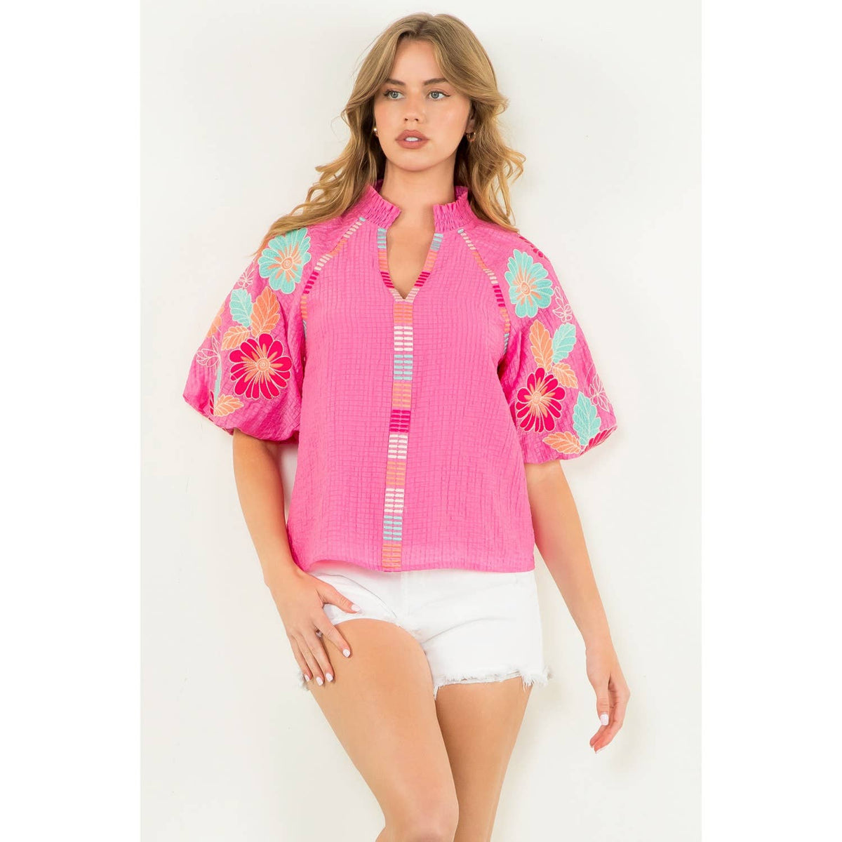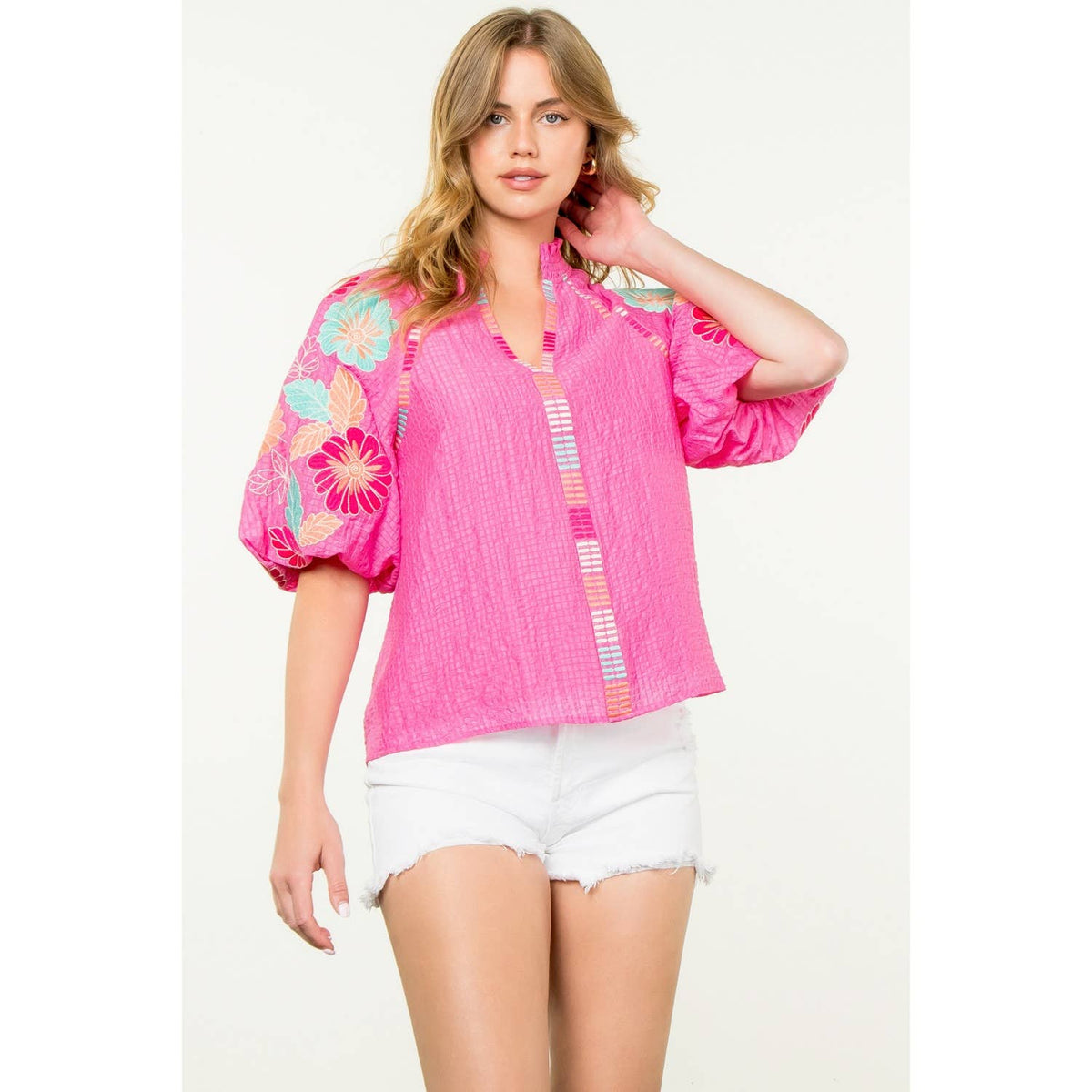 Embroidered Puff Sleeve Top . / Style Measurements for Size S / Designed in USA - Body Length: 24 in - Bust Width: 39 in - Sleeve Length: 16 3/4 in . / Model Sizes - Wearing Size S - Height 5' 9", Bust 32", Waist 25 1/2", Hips 36" . / Prepack Contents - In a Pack of XS(1), S(2), M(2), and L(1) per Color Only . / Fabric Content - WOVEN / 75% Tencel, 25% Nylon
