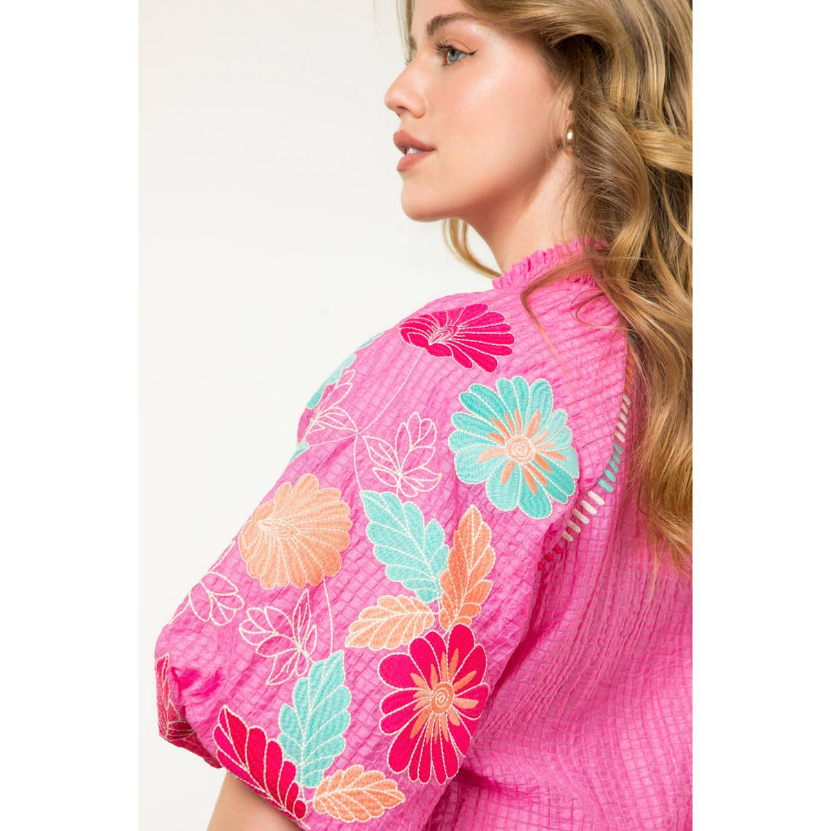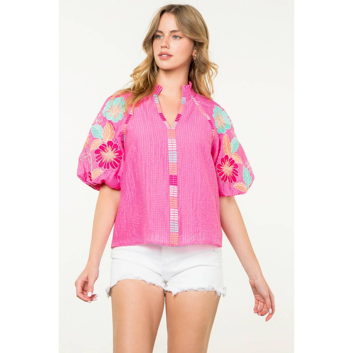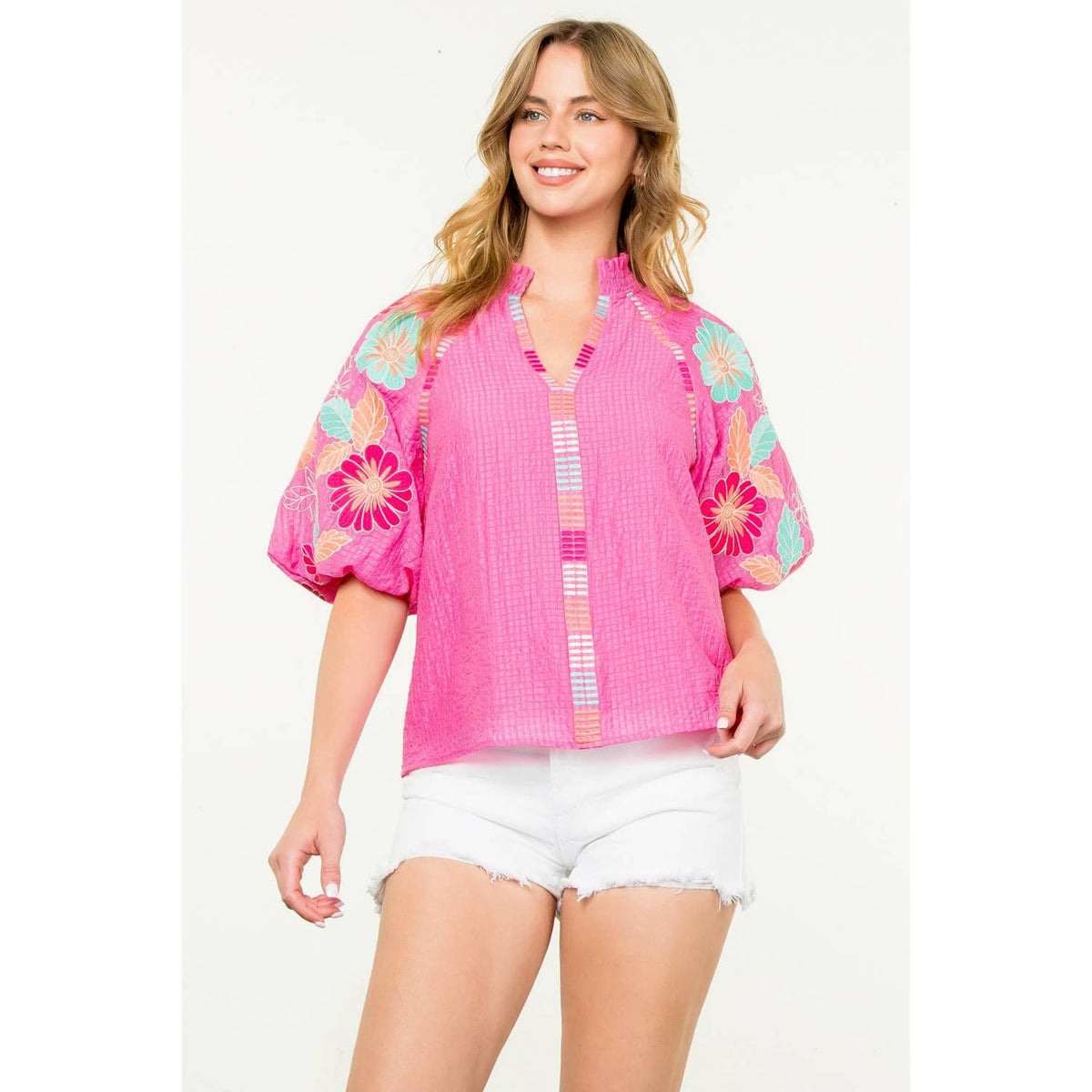 Embroidered Puff Sleeve Top . / Style Measurements for Size S / Designed in USA - Body Length: 24 in - Bust Width: 39 in - Sleeve Length: 16 3/4 in . / Model Sizes - Wearing Size S - Height 5' 9", Bust 32", Waist 25 1/2", Hips 36" . / Prepack Contents - In a Pack of XS(1), S(2), M(2), and L(1) per Color Only . / Fabric Content - WOVEN / 75% Tencel, 25% Nylon