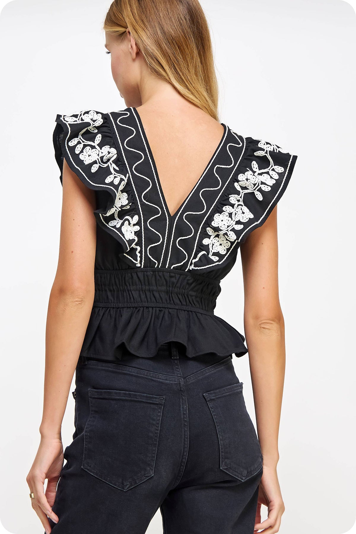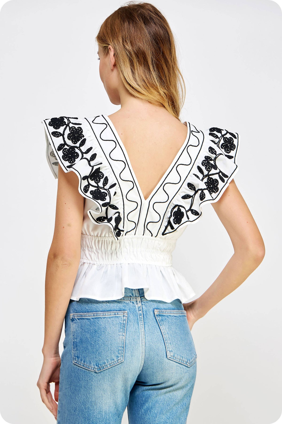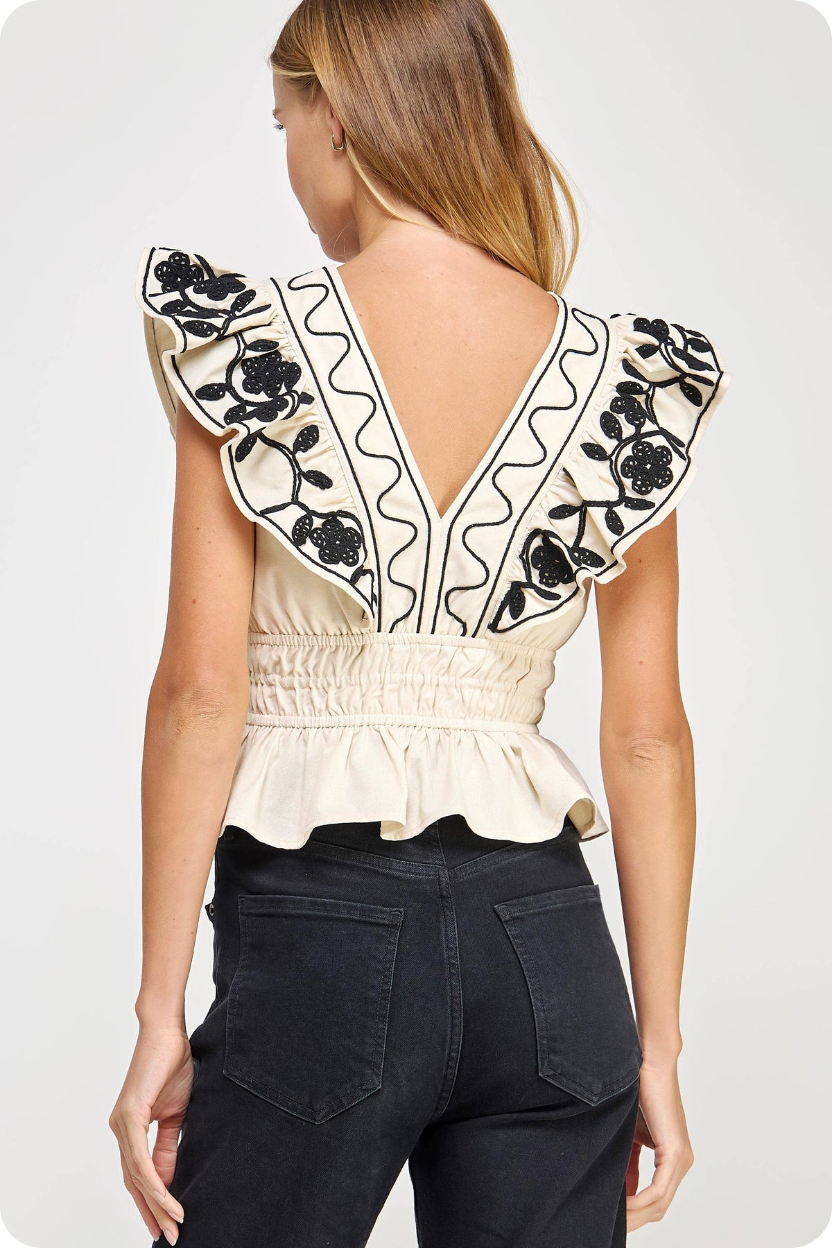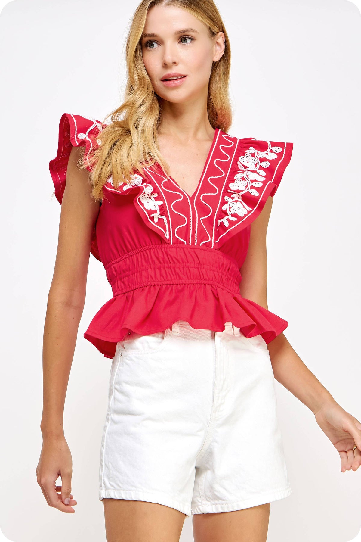 Embroidered ruffled top in Linen Cotton blend fabric. This sleeveless blouse features a classic V neckline, a ruffled peplum hem, elasticated cinched waist, and an intricate floral pattern embroidery detailing. Can be made a set with P-3397-JK.