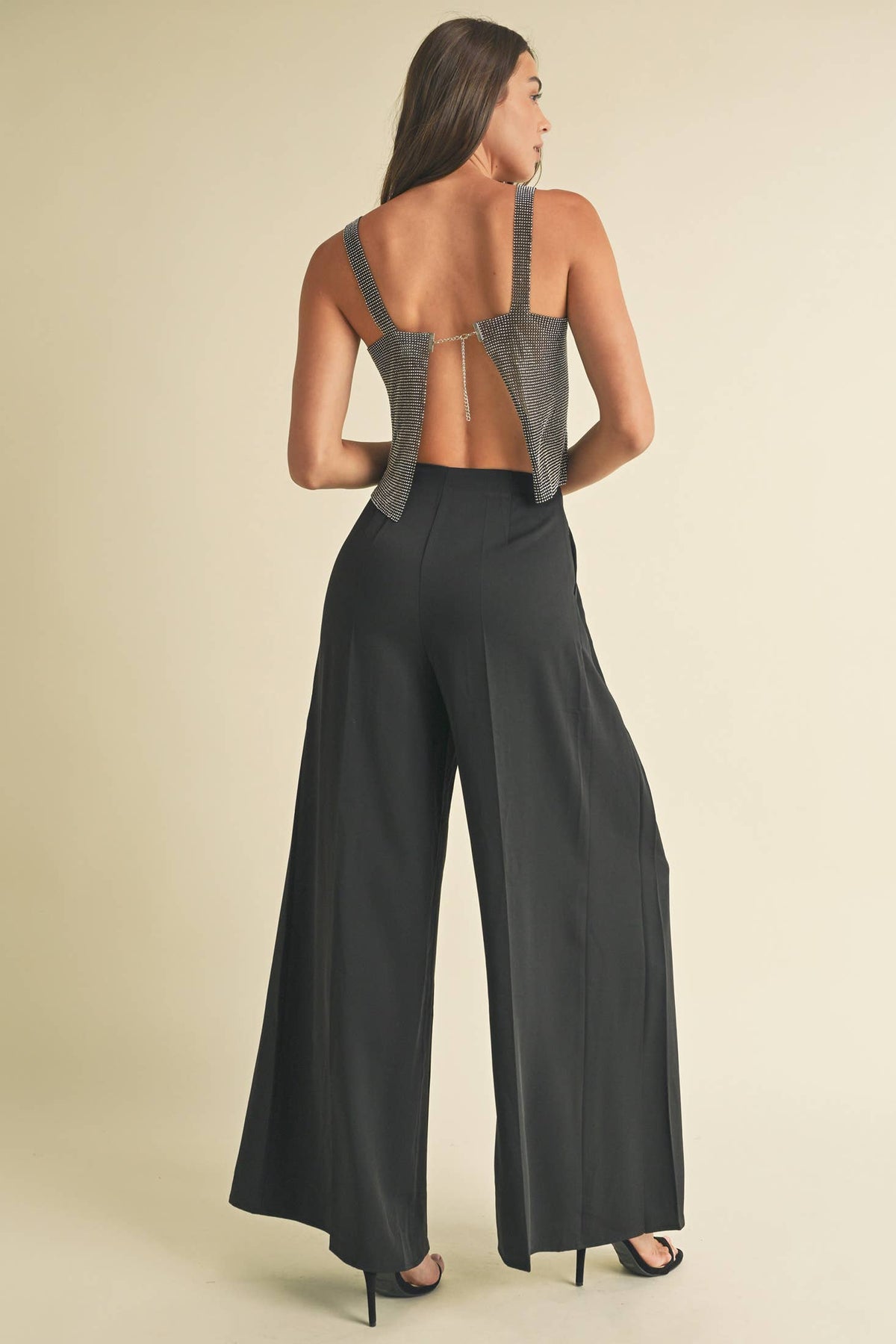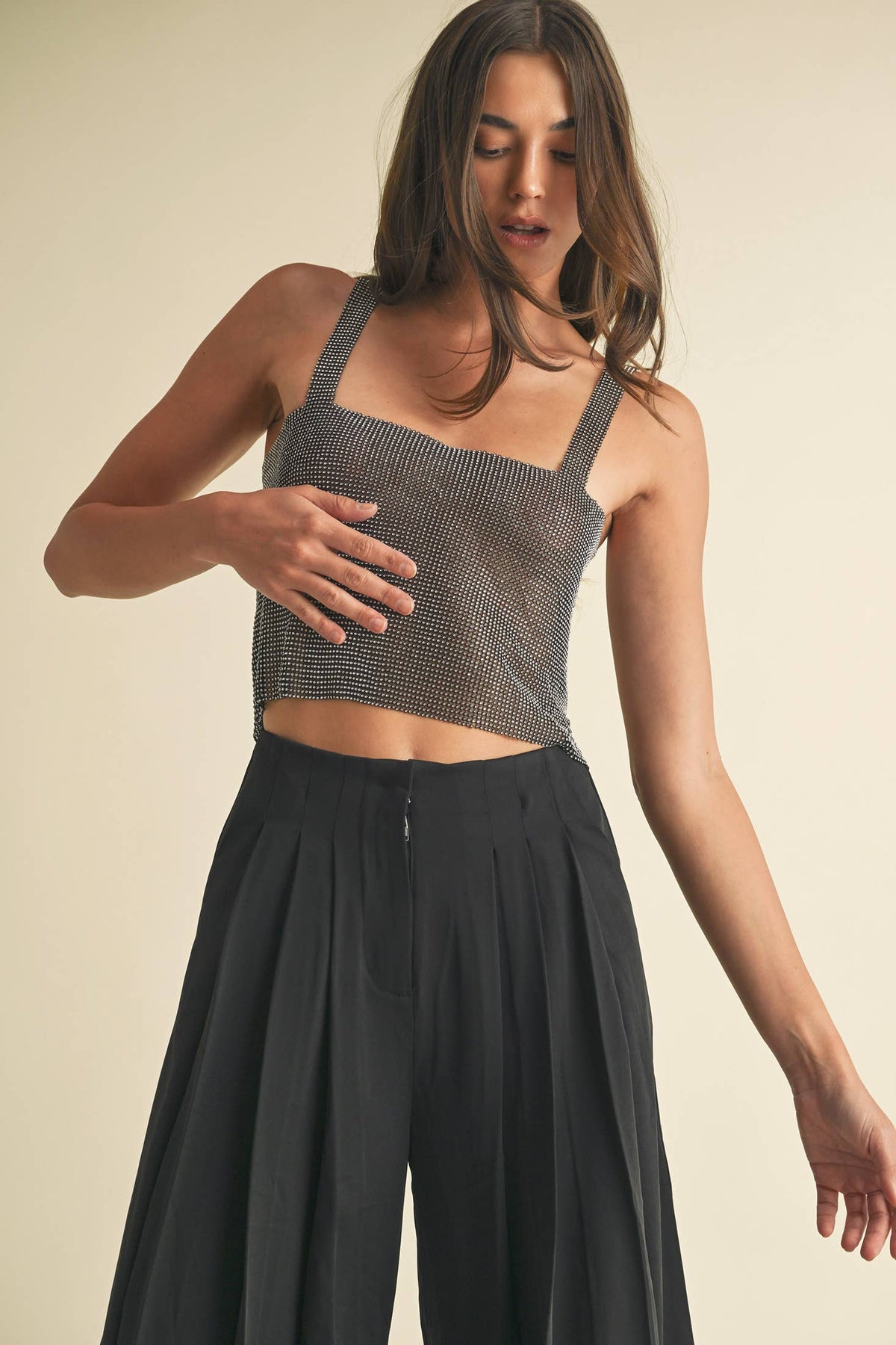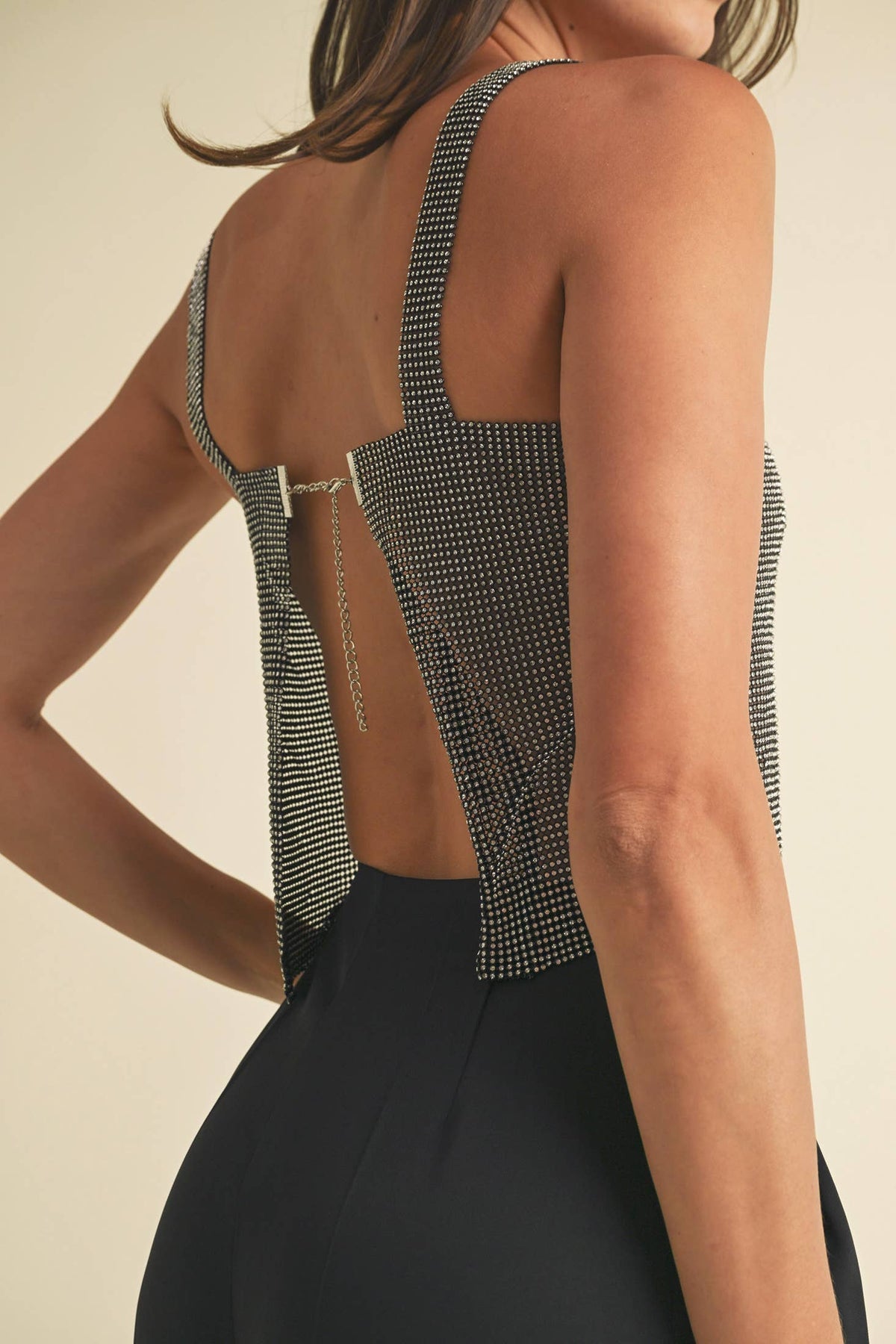Straight, cropped top in rhinestone-decorated mesh with a square neckline, wide shoulder straps and an opening at the back with an adjustable metal-chain fastener. Unlined.