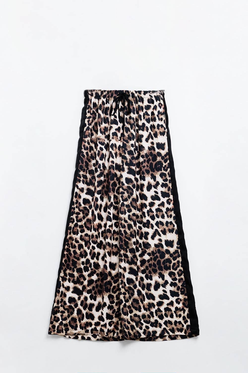 Wide leopard print pants in a fluid soft-touch fabric with a black satin sideline. The Pants are fitted at the waist with a tie. Length: Full length. Subcategory: Pants. Print: Animal print. Fit: Relaxed fit. Style: Party. Fabric: Satin . runs true to size. S. 100% Polyester