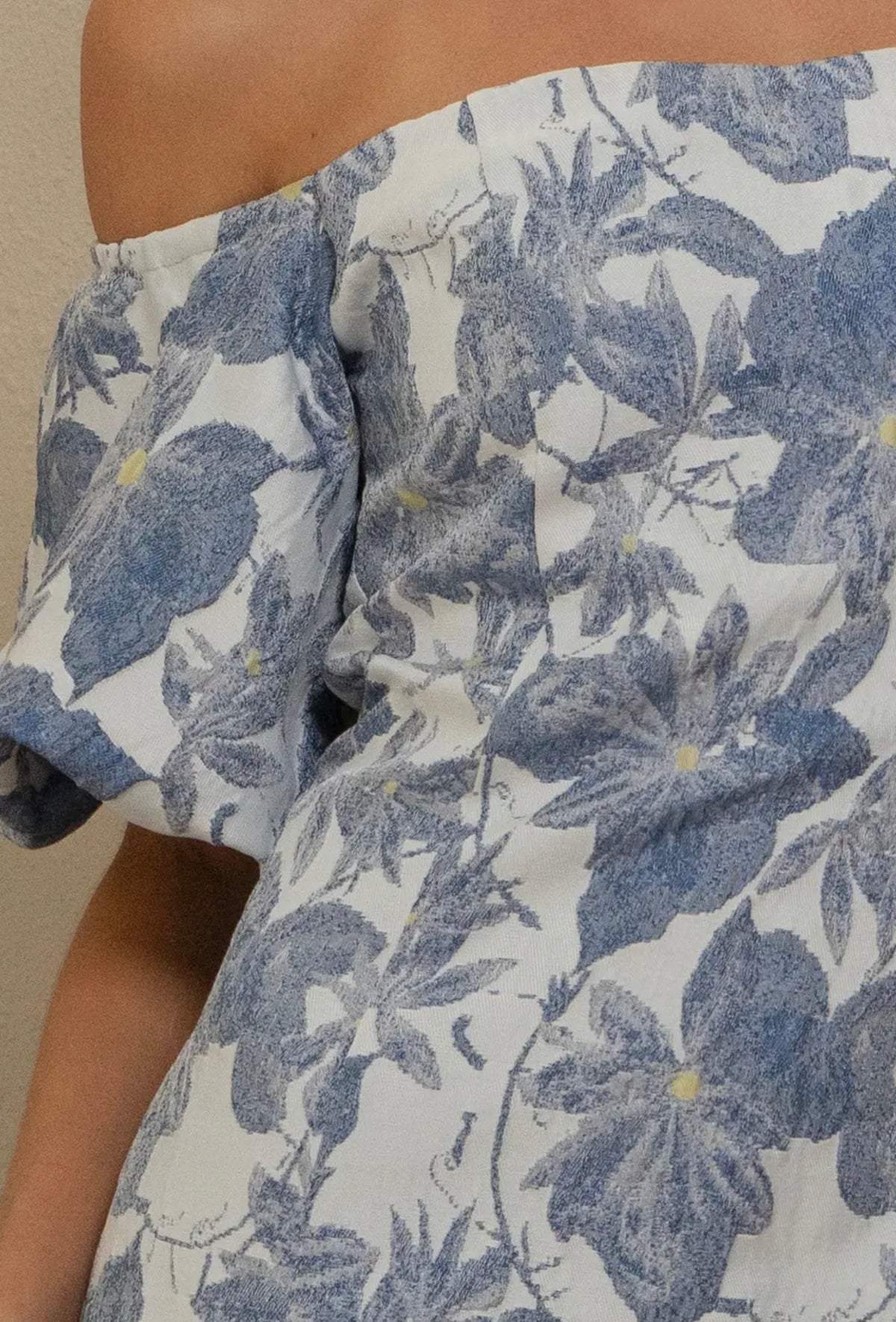 Off-shoulder mini dress in a floral print. Made in shades of pale blues, this dress showcases dramatic, puff sleeves.