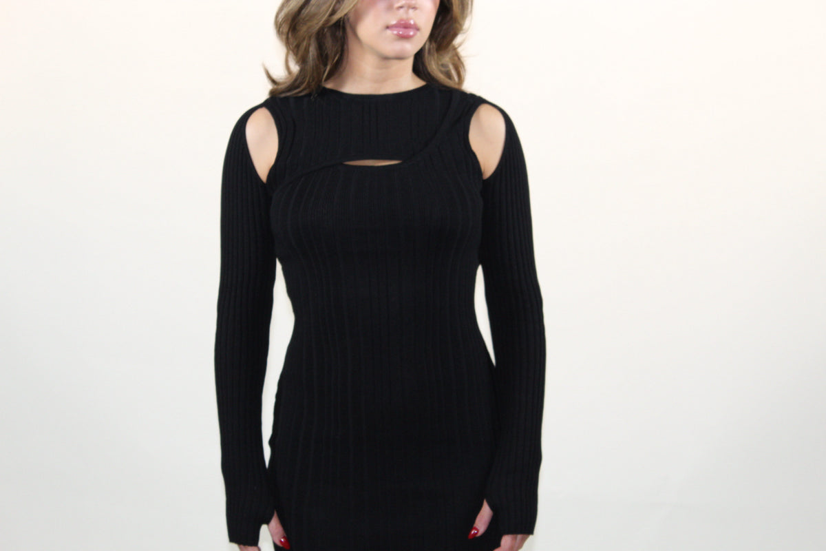 This ribbed long sleeve dress offers style without sacrificing comfort. Enjoy the fun of laser-cutouts, while the mini length and 89% Viscose 11% Nylon fabric keep you feeling comfy and fancy. It's the perfect blend of fashionable and functional!