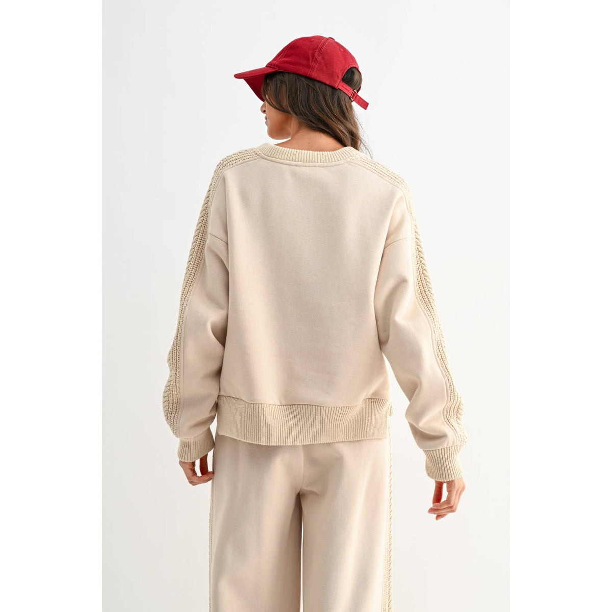 Both pieces are accented with intricate cable knit trim running down the outer sleeves and pant legs, adding a textured, elevated touch. The top has a relaxed, drop-shoulder fit with ribbed cuffs and hem, while the pants offer a high-rise elastic waistband with a loose, flowy silhouette for all-day ease. SELF: 53% COTTON 47% POLYESTER CONTRAST: 60% COTTON 40% ACRYLIC Model is wearing a size S Model : 5'9" - B 32" - W 24" - H 36.5"