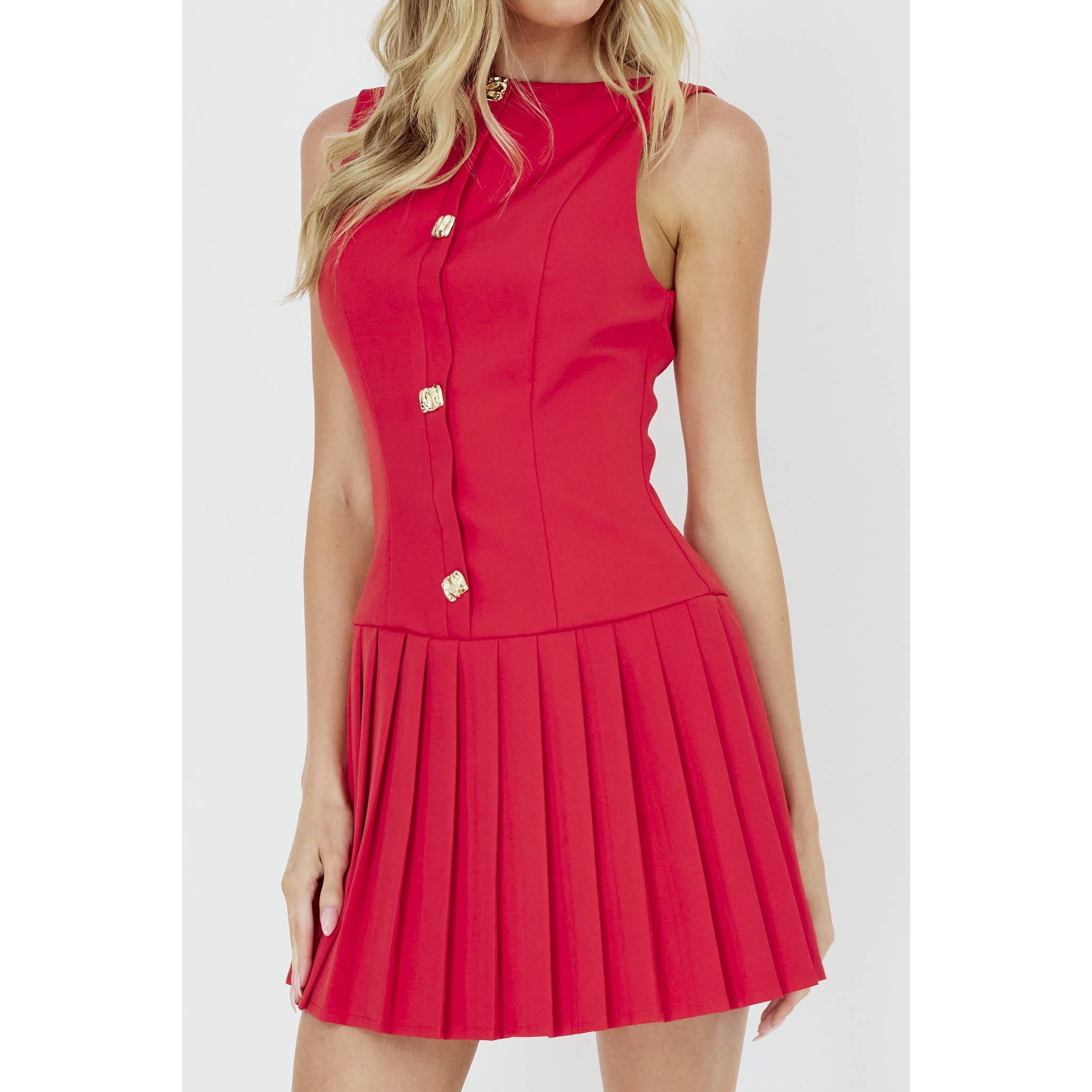 The dress is a vibrant red, sleeveless design with a fitted bodice and a pleated, flared skirt that ends above the knee. It features a high neckline adorned with three decorative gold buttons down the front, adding a touch of elegance to the bold color.