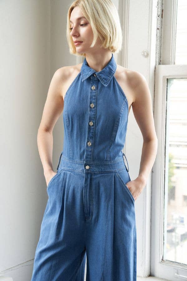 A washed denim jumpsuit featuring halter neckline, collar, button down with zipper closure, side pocket, wide leg and smocked back bodice