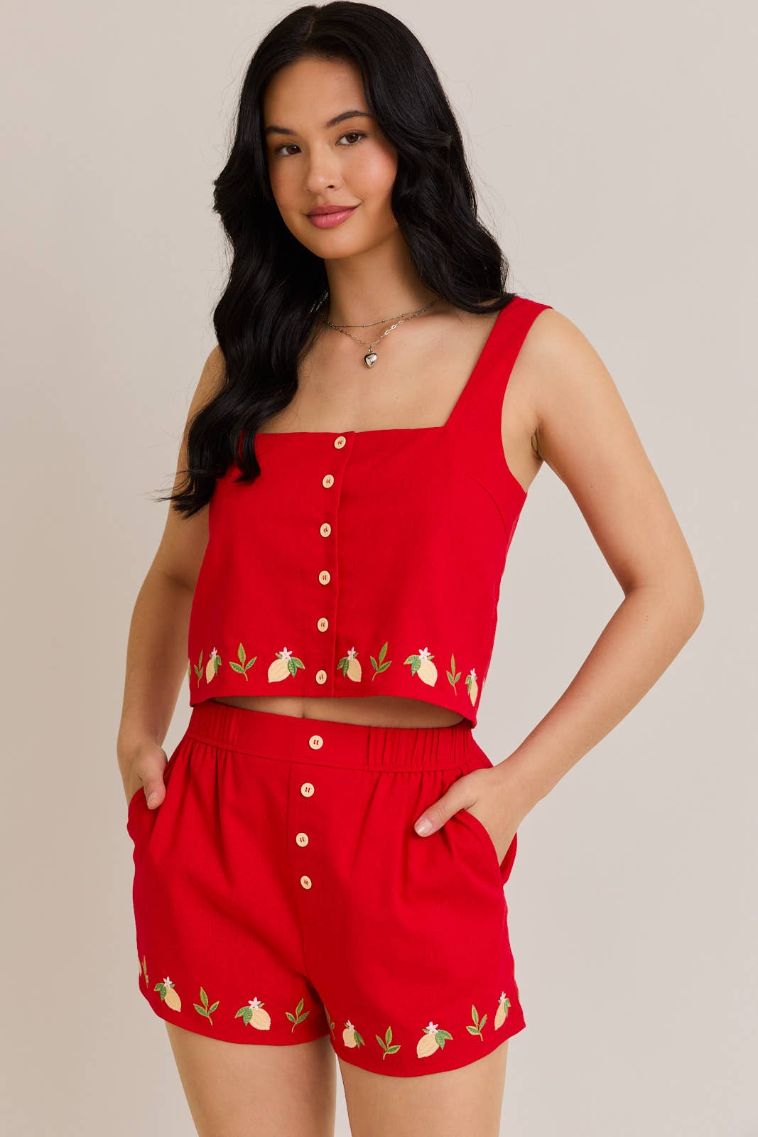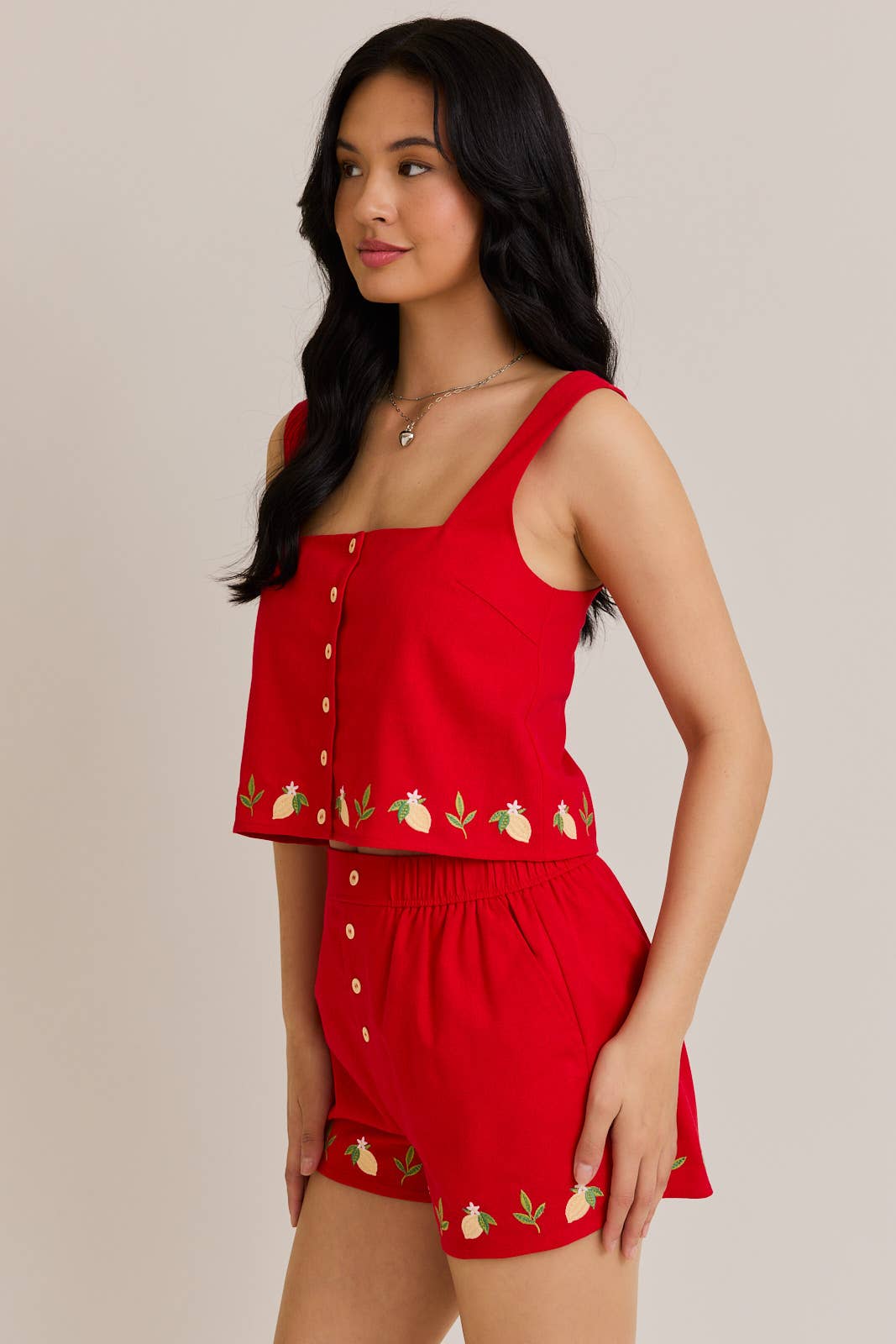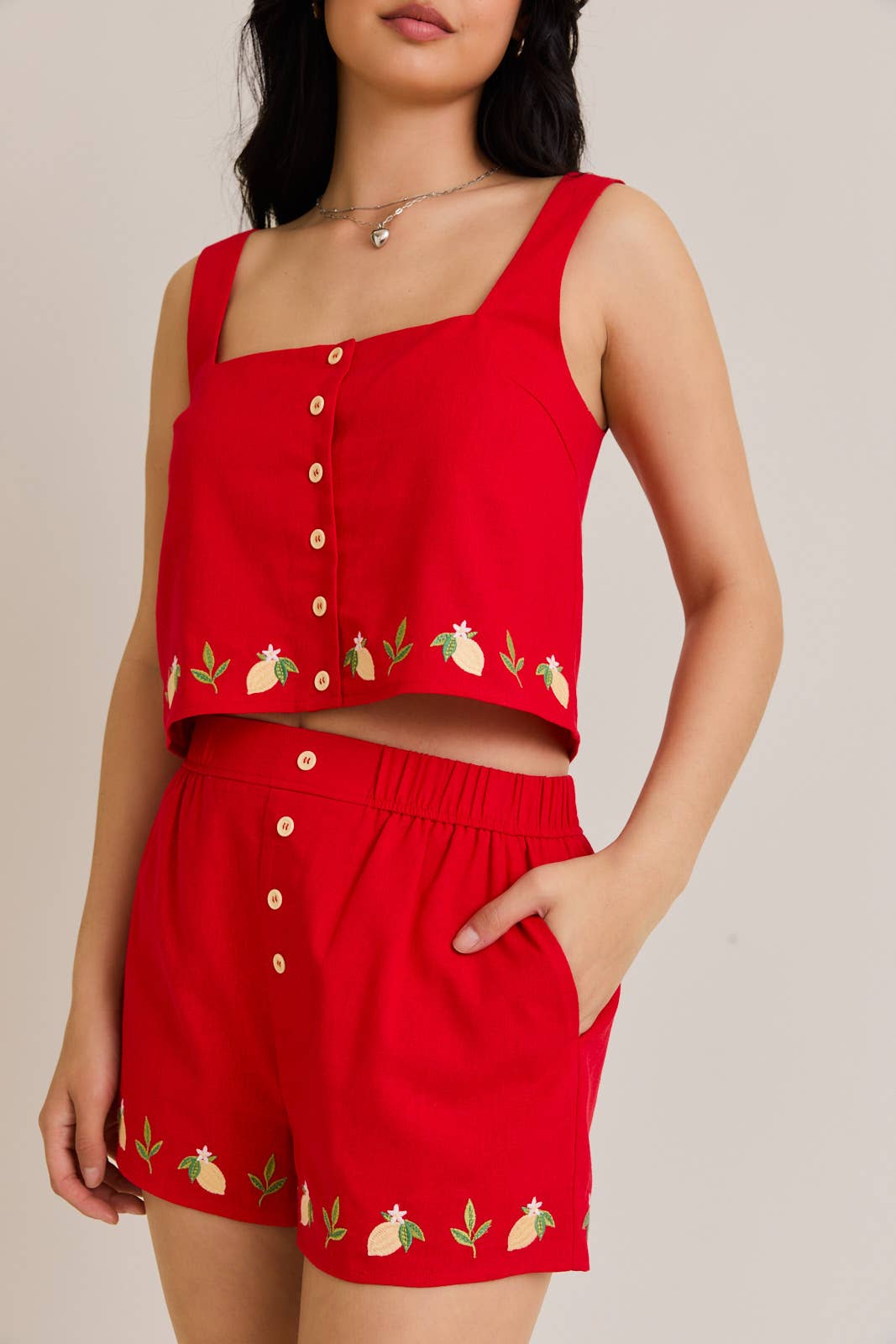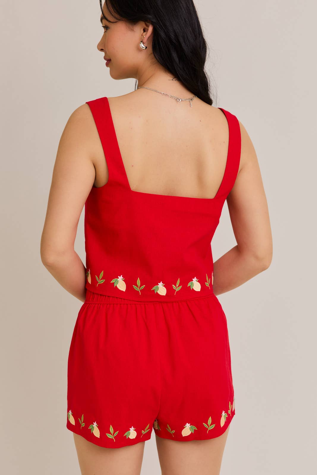 Red Embroidery Lemon Short Set