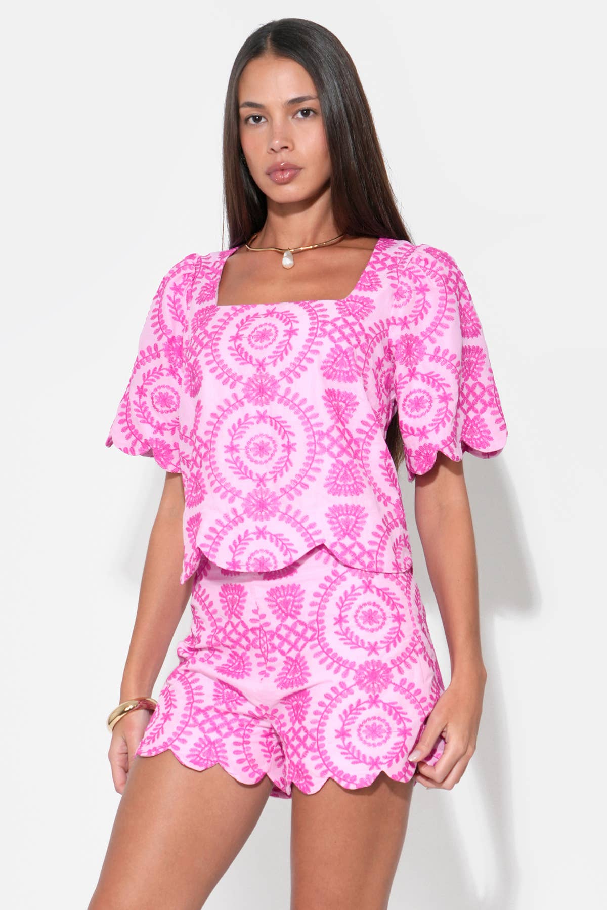The design is defined by its all-over rose embroidery, where the deep magenta floral motifs create a beautiful, raised contrast against the lilac base. The standout feature is the scalloped hemline, which follows the natural curve of the floral pattern to add a flirty, feminine finish.