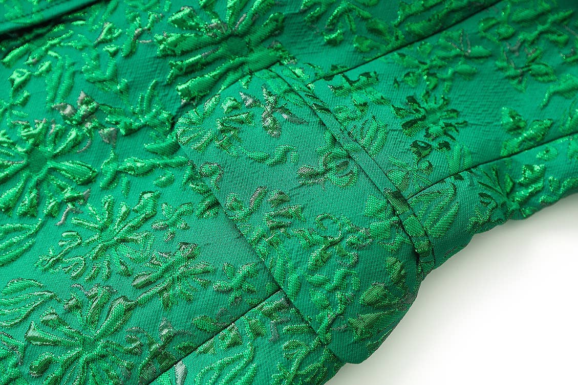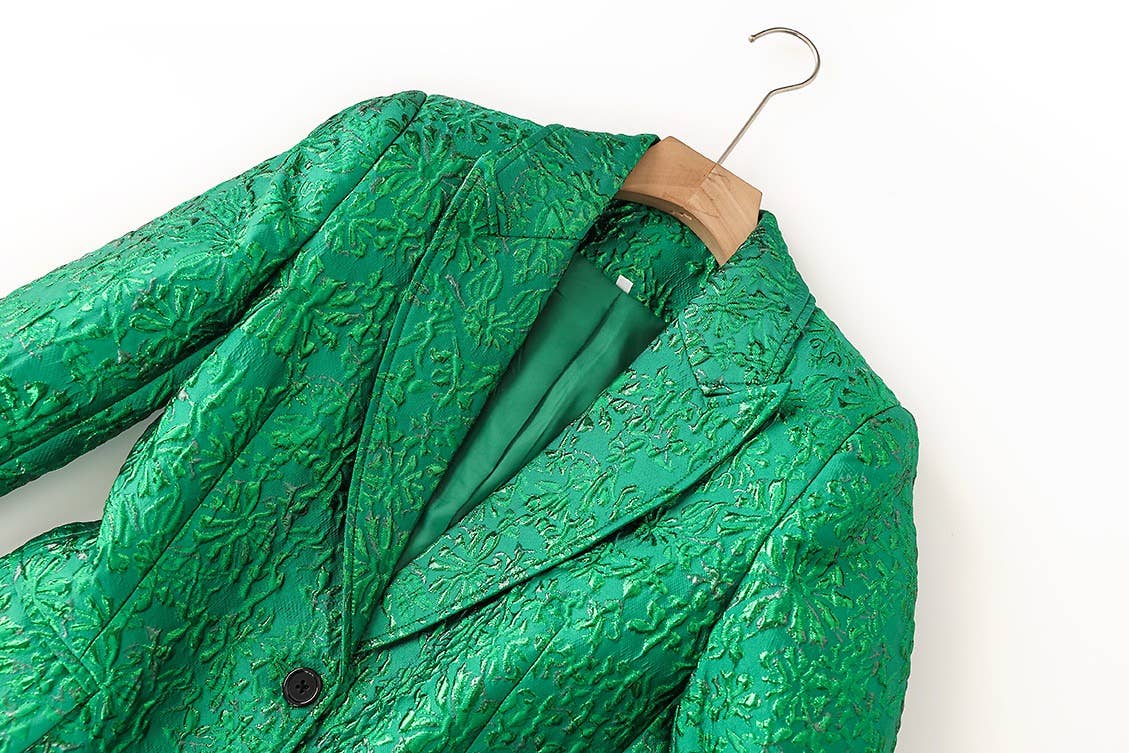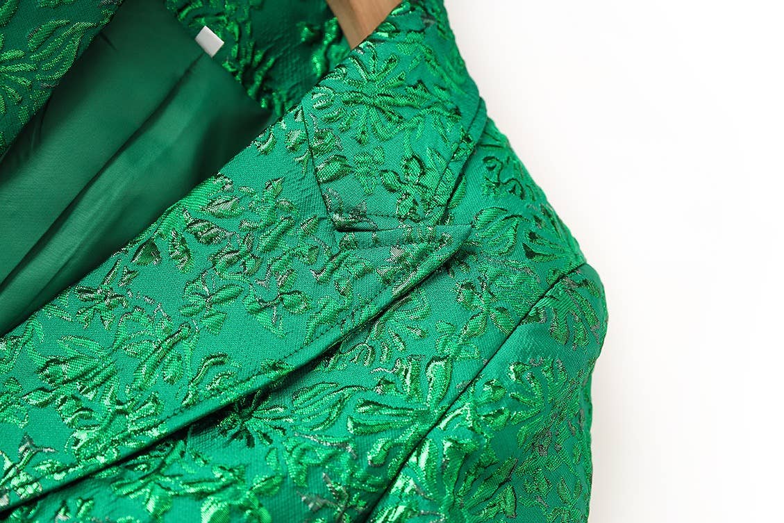 Dive into the world of luxury with our Elegant Green Jacquard Suit Set. The blazer boasts refined jacquard embroidery, offering mesmerizing visual texture. Paired with wide-leg trousers, this set promises style and comfort. Ideal for formal events or making a statement in the professional world. Quality, elegance, and comfort - all wrapped in one exquisite set. Perfect for online wholesale business!