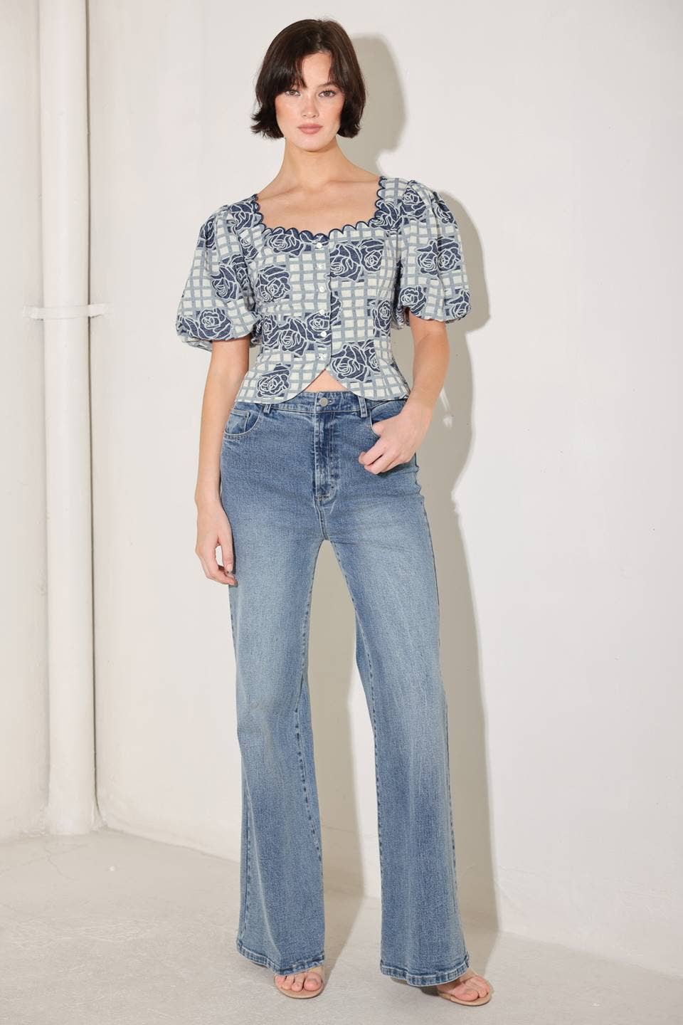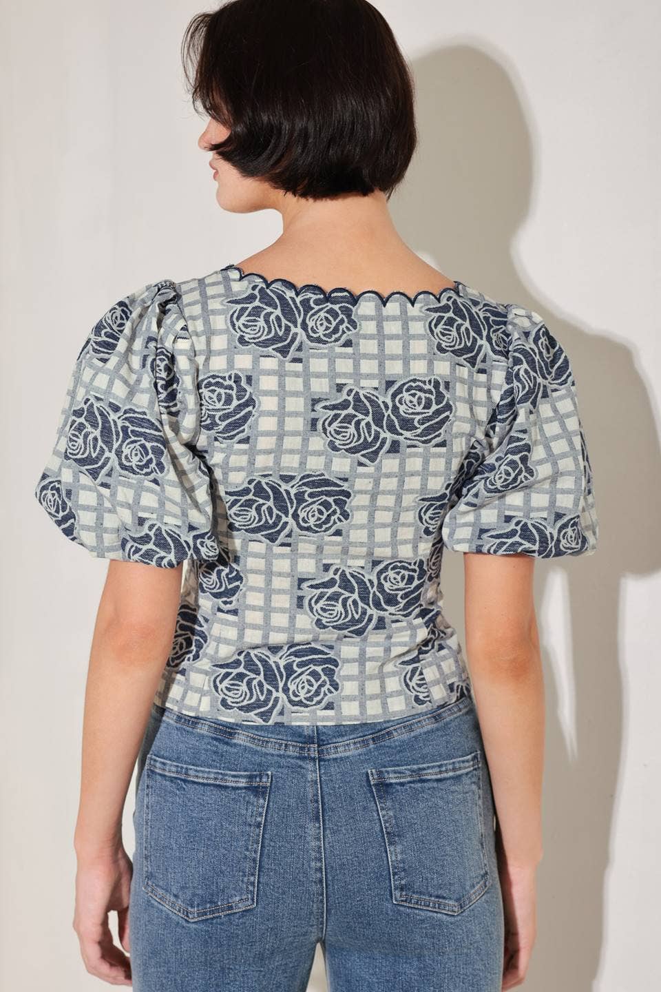 A woven jacquard top featuring square neckline with scallop edge, short puff sleeve and button down. Details: Self : 60% Cotton 40% Polyester Size & Fit - Model is 5`8" And Wearing Size Small - Measurements Taken From Size Small - Approx. Length: 19"