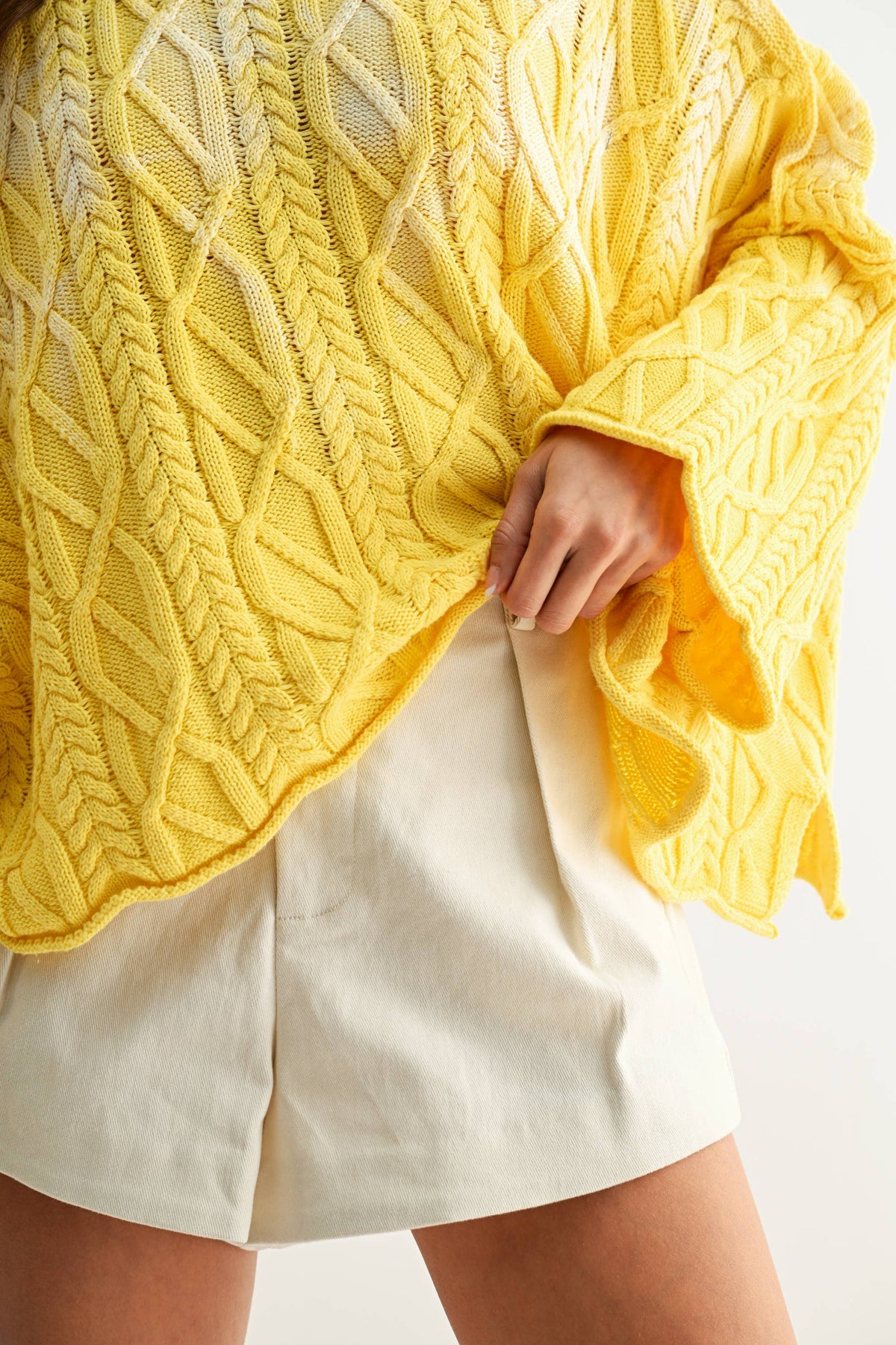 This yellow cable knit oversized sweater features a relaxed fit and a geometric cable pattern throughout the fabric. The wide sleeves and slightly scalloped hemline add to its loose and comfortable design. The crew neckline and dropped shoulders contribute to the casual, effortless look. The sweater is lightweight and suitable for layering over other garments. SELF: 100% COTTON Model is wearing a size S Model : 5'9" - B 32" - W 24" - H 36.5"