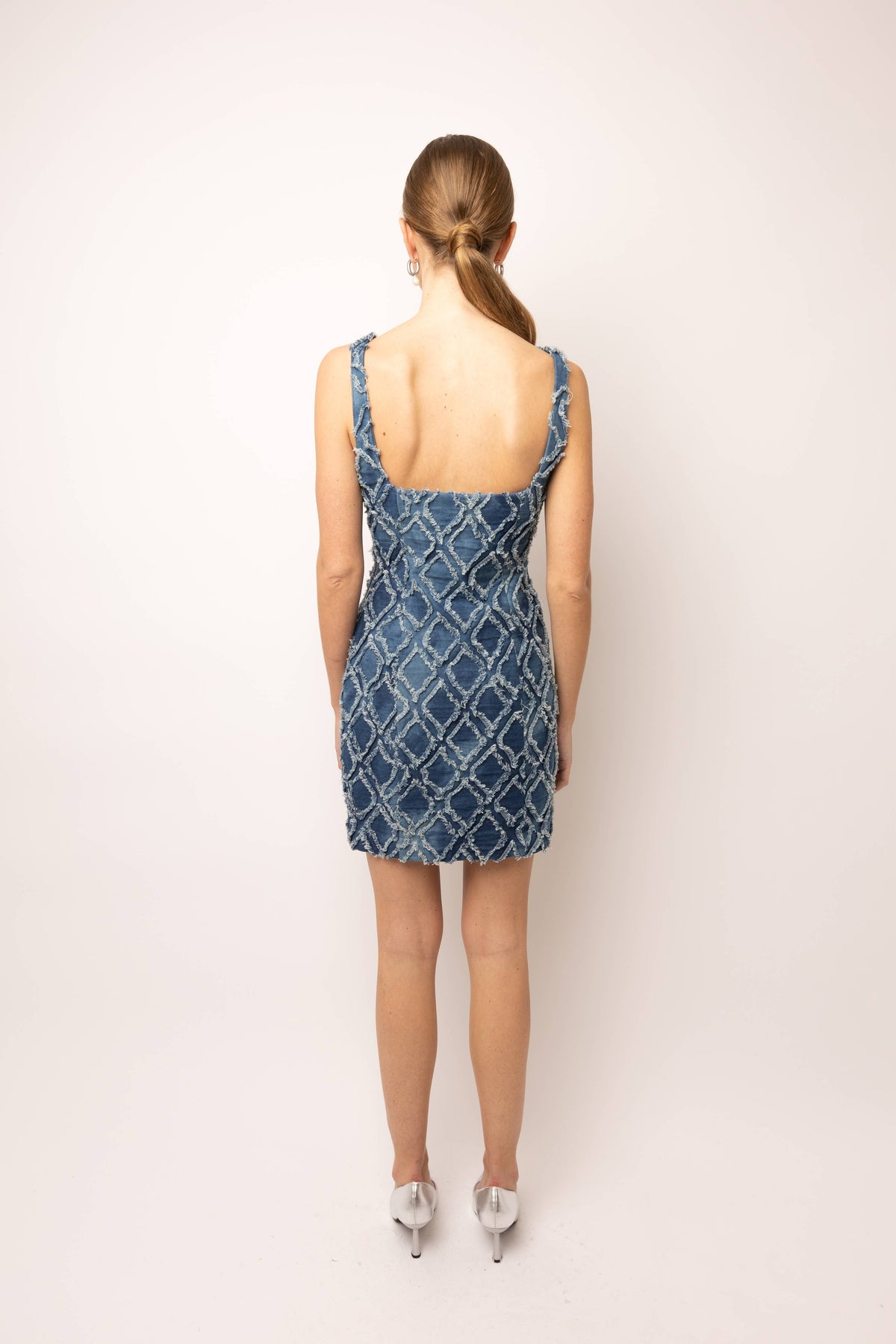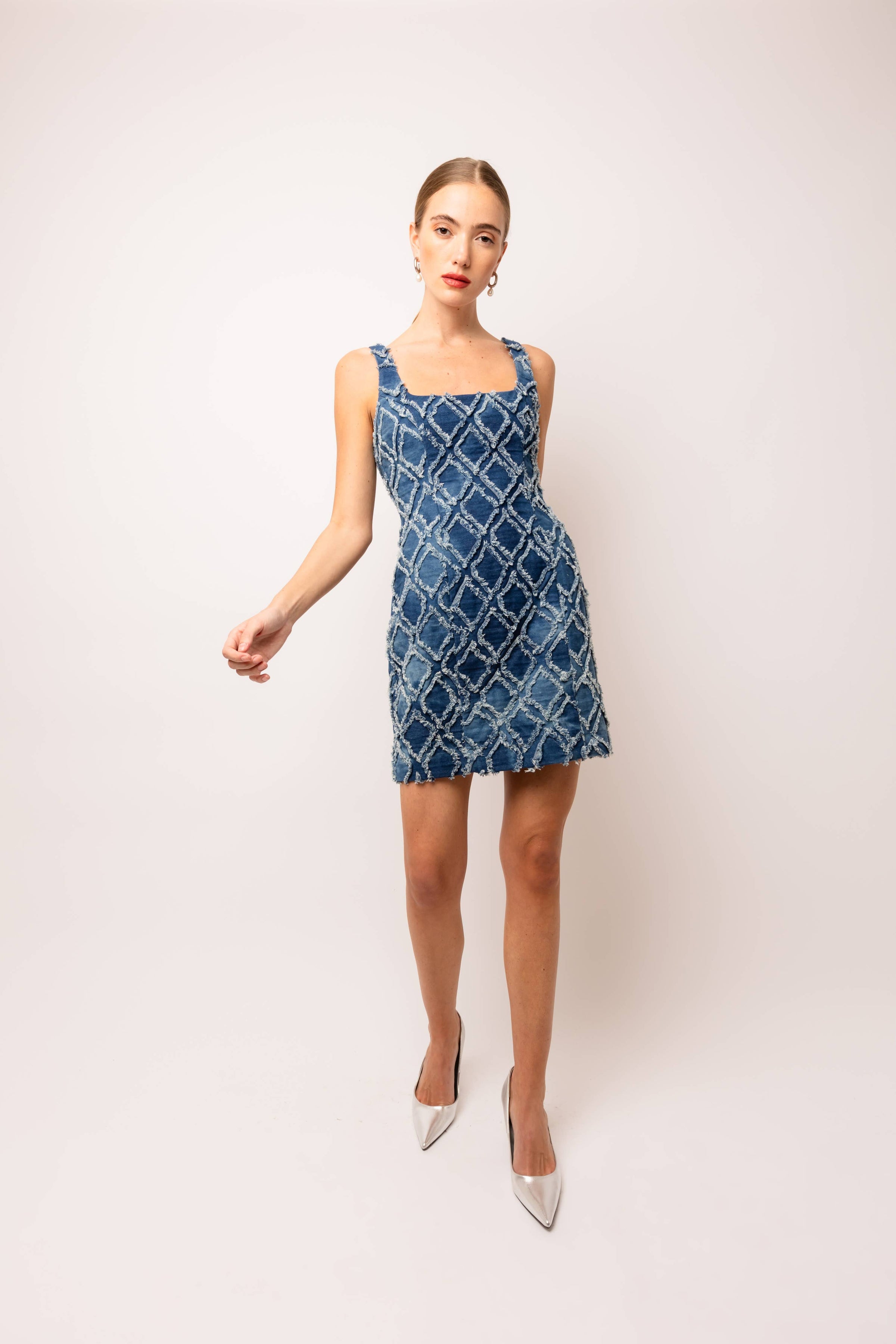 This fitted dnim mini shift dress has a directional square neckline and is made from a unique diamond pattern dark wash stretch blue denim. With a rear zip fastening this sleek style screams elegance whilst the dnim fabric keeps it cool!