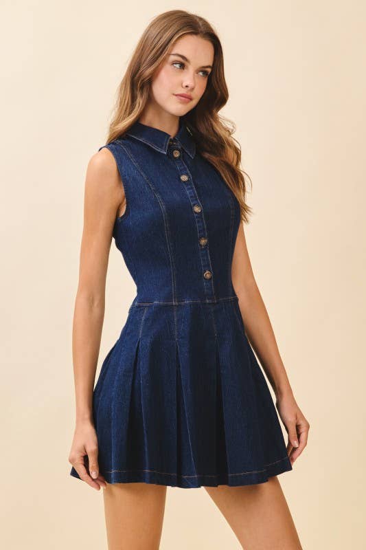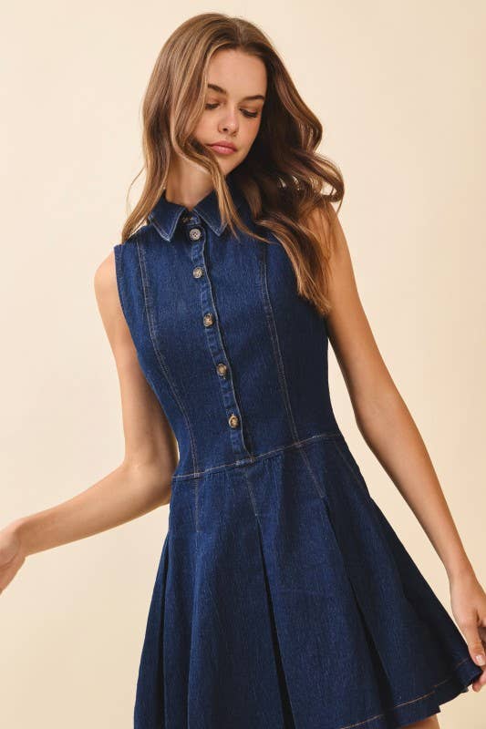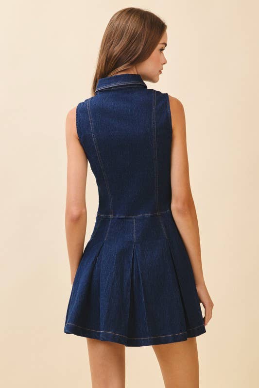 A sleeveless denim mini dress featuring a collared neckline, button-front closure, and structured pleated skirt. Fitted through the bodice for a flattering silhouette.