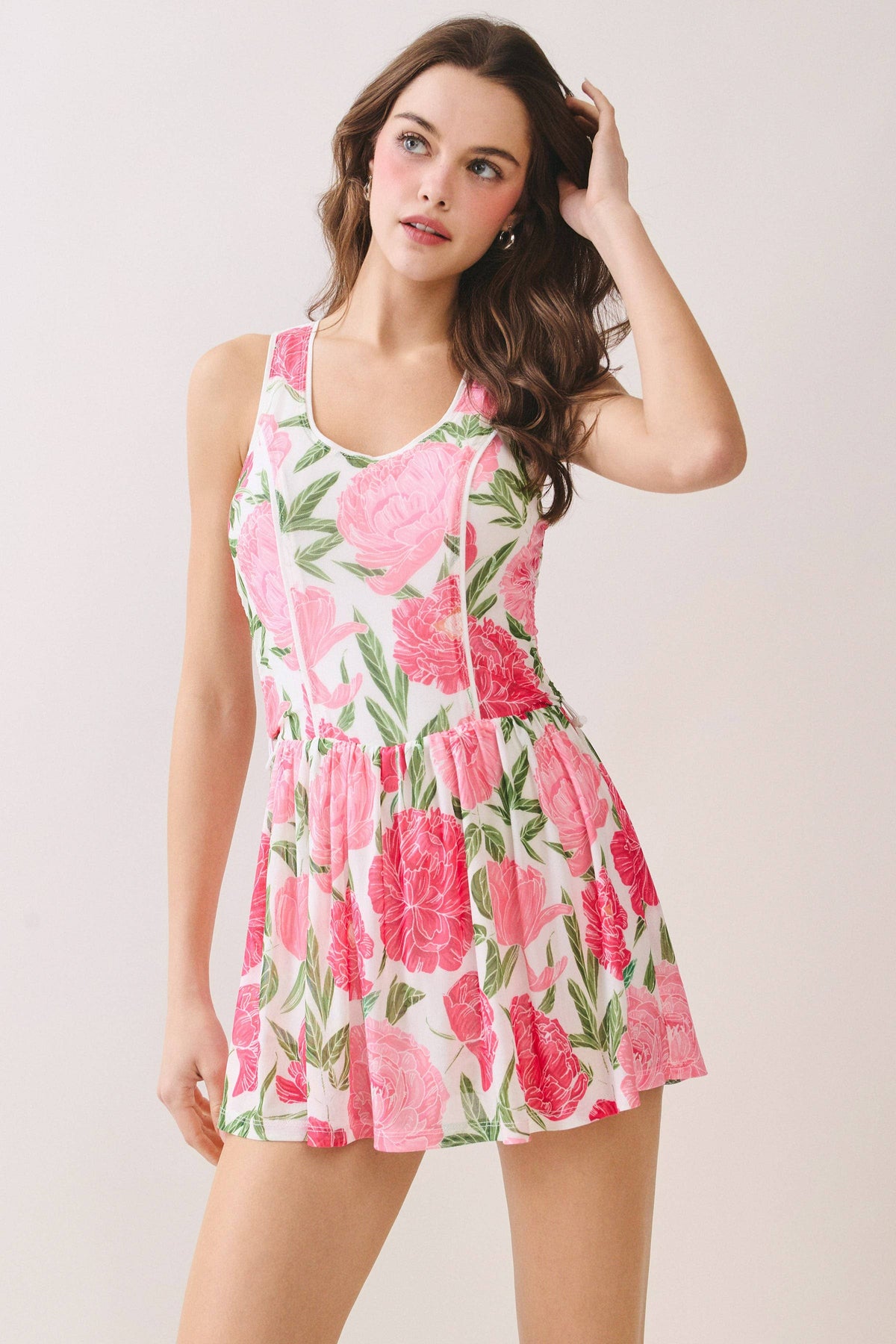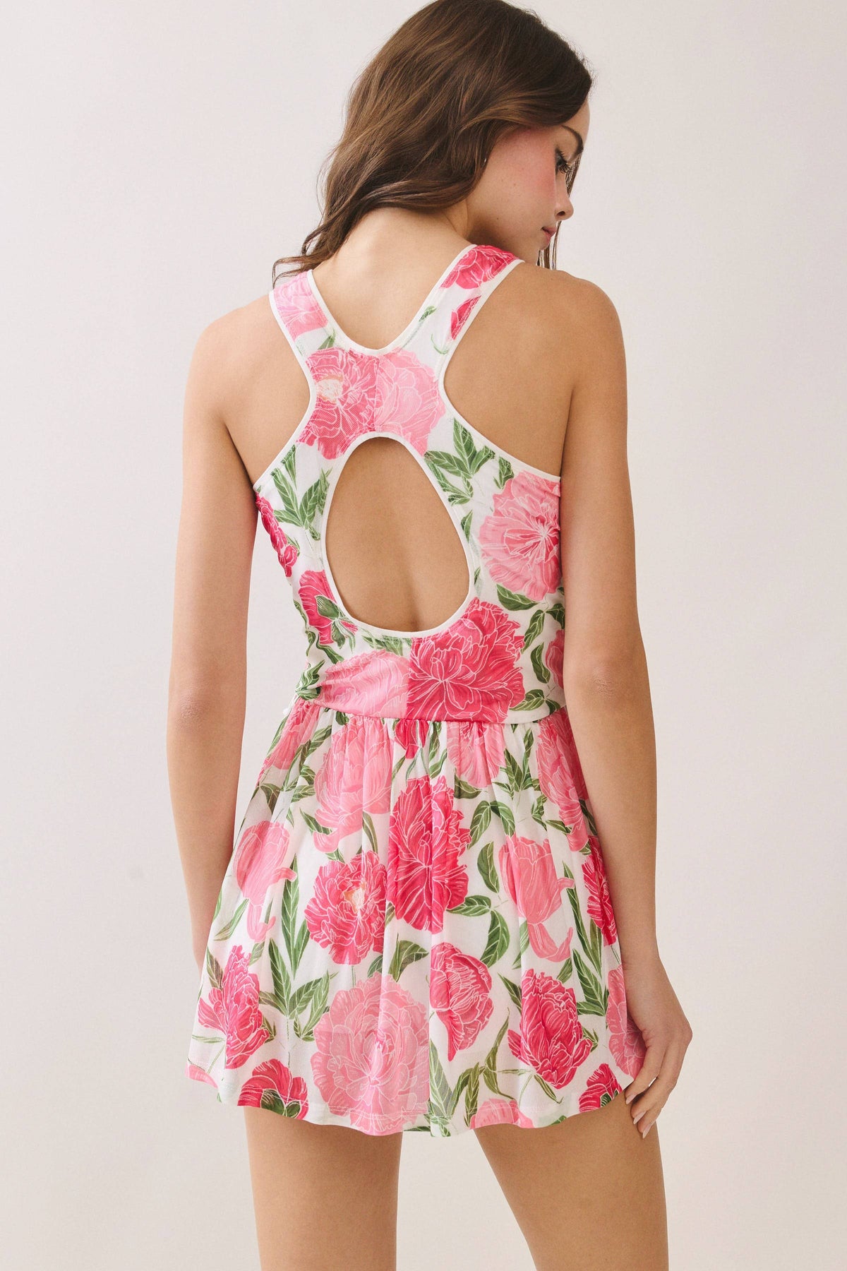 A floral-print athletic dress featuring a scoop neckline and sleeveless silhouette. Designed with a fitted bodice and a flared skirt. Finished with a racerback keyhole detail and built-in shorts for added comfort and coverage.