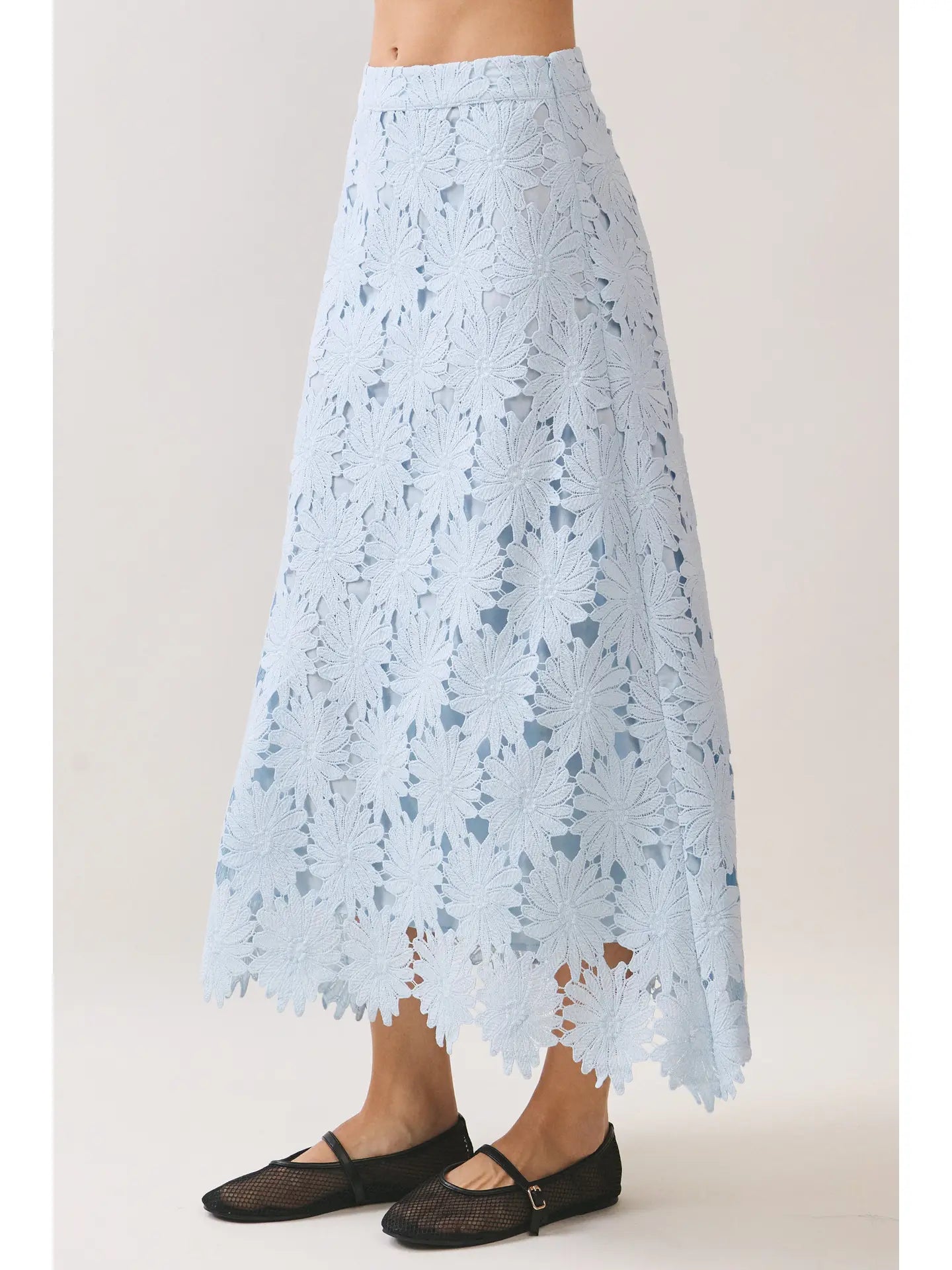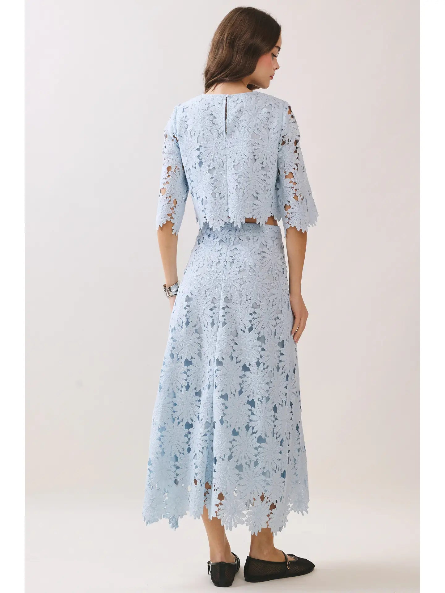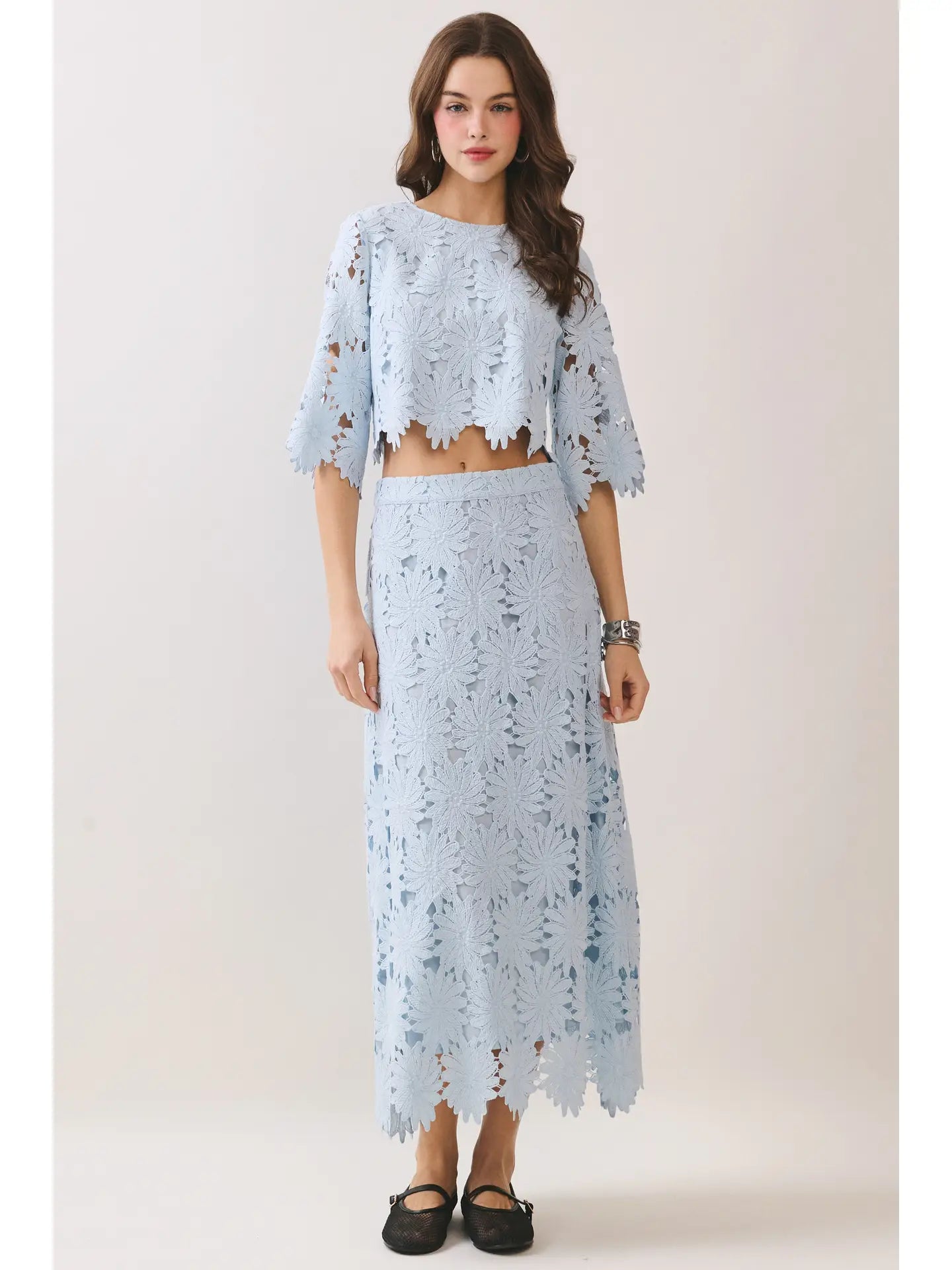 A floral lace cropped top featuring a relaxed silhouette and elbow-length sleeves. Designed with a round neckline and a scalloped hem for a delicate finish. Finished with a back keyhole button closure. Pair with matching skirt CS3985.