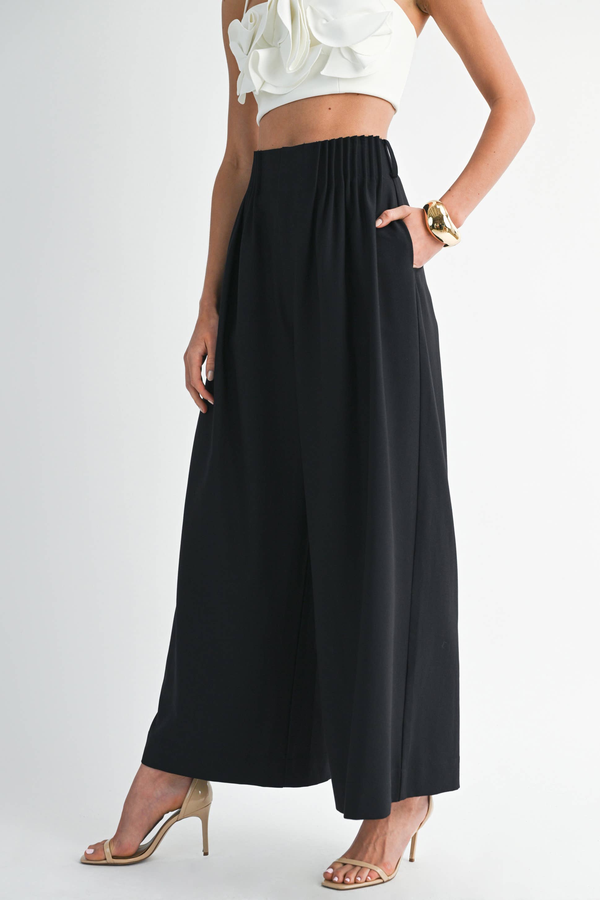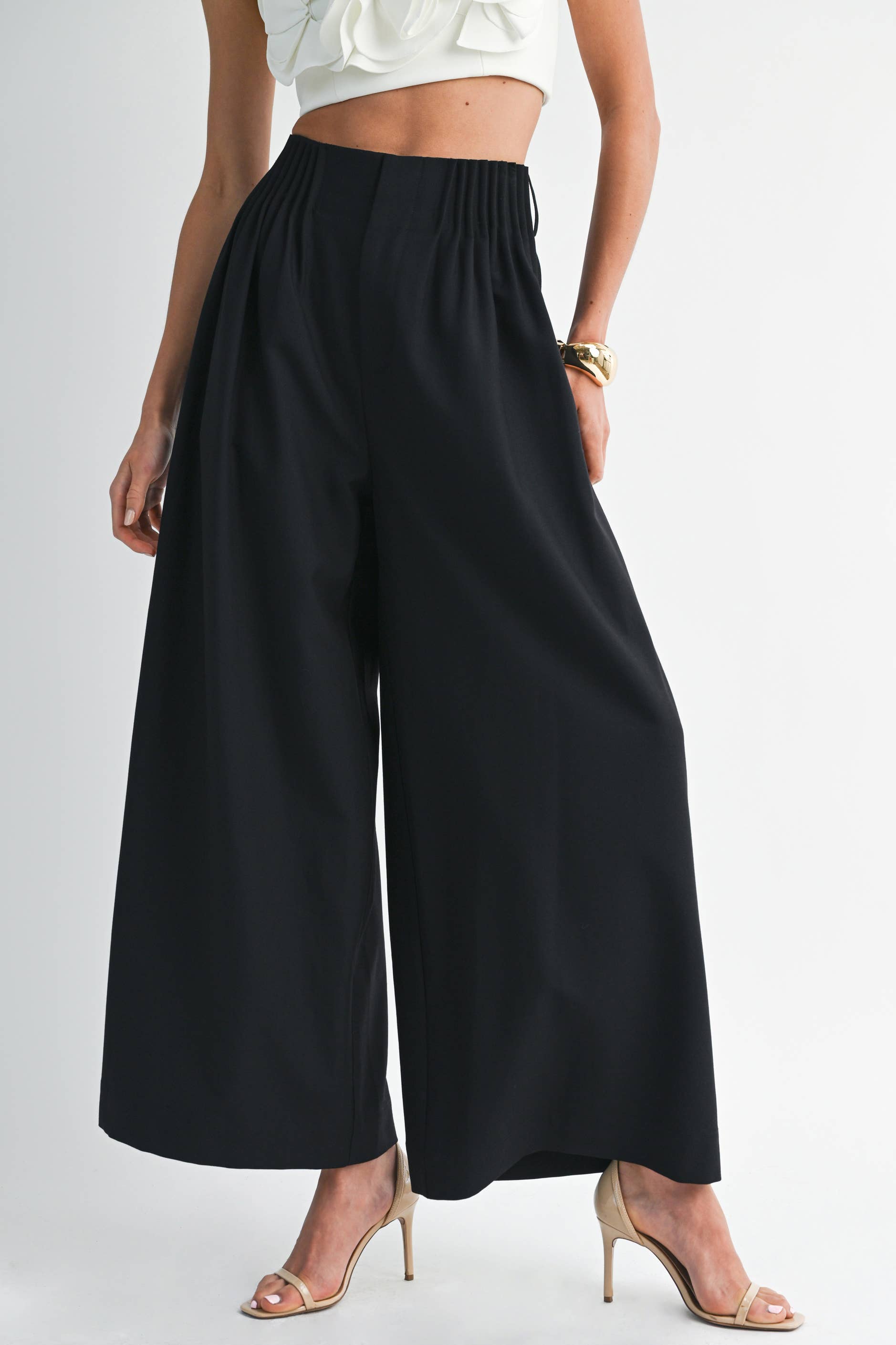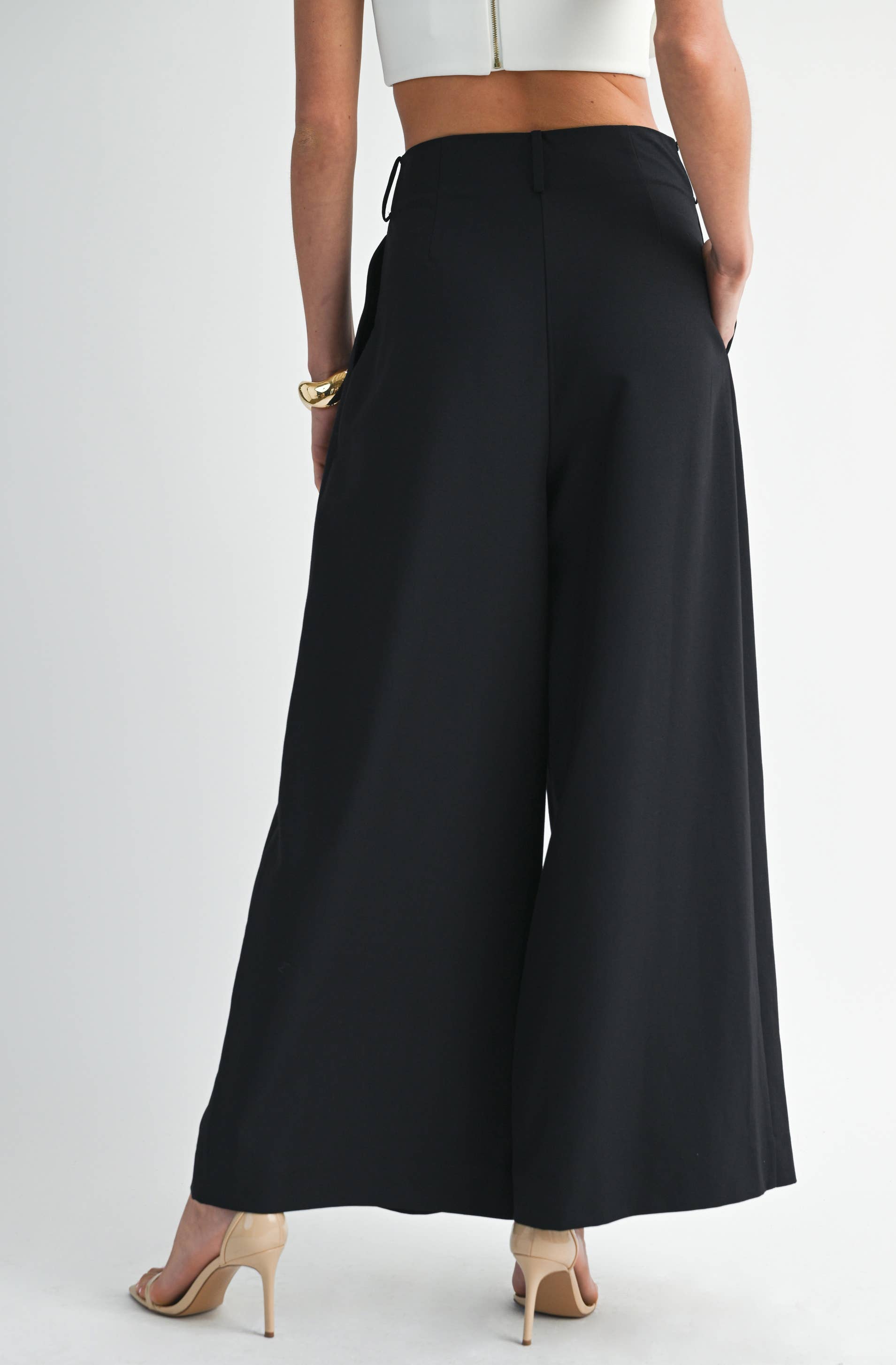 Relaxed fit Pleated Pants featuring Mid rise, wide leg with slant hip pockets, front button closure and zip fly. Perfect for both work and going out moods.